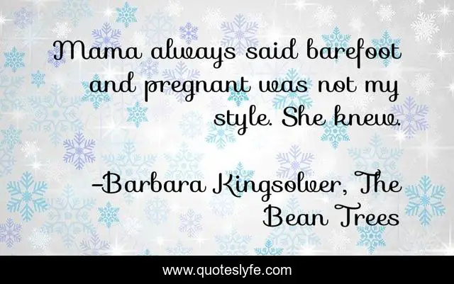 "Barbara Kingsolver, The Bean Trees Quotes." Quoteslyfe.com, 2025. Sat. 06 Dec. 2025. <https://www.quoteslyfe.com/quote/Mama-always-said-barefoot-and-pregnant-was-258195>.