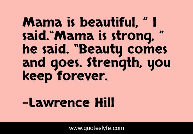 This page presents the quote "Mama is beautiful, ” I said.“Mama is strong, ” he said. “Beauty comes and goes. Strength, you keep forever.". Author of this quote is Lawrence Hill. This quote is about strength, beauty,.