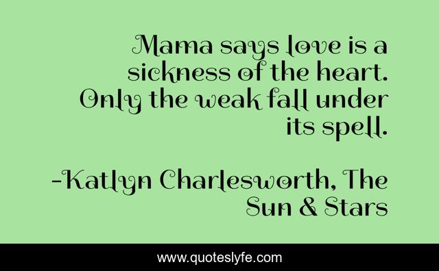 This page presents the quote "Mama says love is a sickness of the heart. Only the weak fall under its spell.". Author of this quote is Katlyn Charlesworth, The Sun & Stars. This quote is about psychological, royalty, historical-fiction, thriller, historical-romance,.
