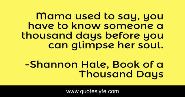 This page presents the quote "Mama used to say, you have to know someone a thousand days before you can glimpse her soul.". Author of this quote is Shannon Hale, Book of a Thousand Days. This quote is about understanding-others, wisdom,.