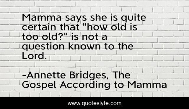 This page presents the quote "Mamma says she is quite certain that "how old is too old?" is not a question known to the Lord.". Author of this quote is Annette Bridges, The Gospel According to Mamma. This quote is about enthusiasm, age, humor, inspirational,.