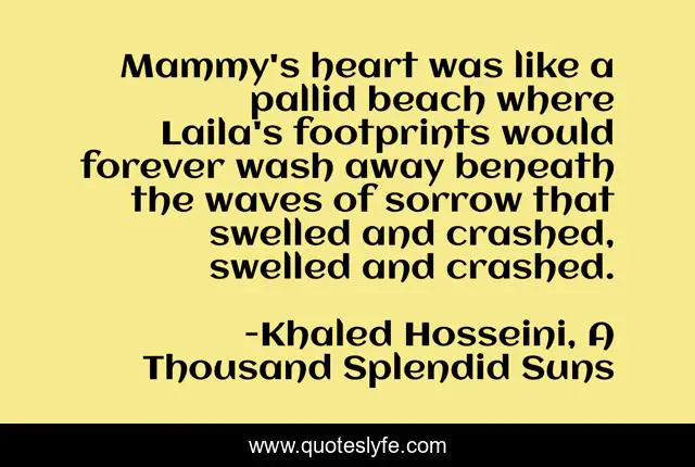 This page presents the quote "Mammy's heart was like a pallid beach where Laila's footprints would forever wash away beneath the waves of sorrow that swelled and crashed, swelled and crashed.". Author of this quote is Khaled Hosseini, A Thousand Splendid Suns. .