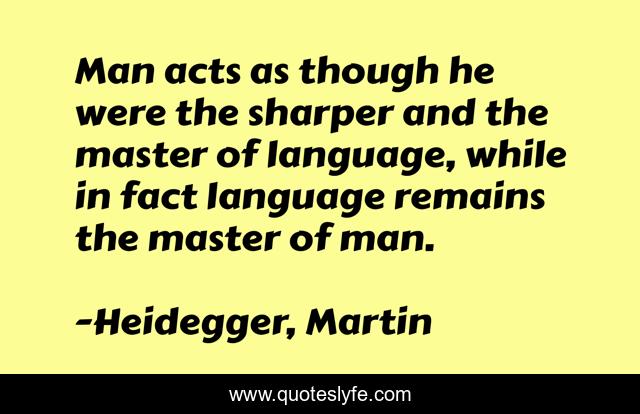 This page presents the quote "Man acts as though he were the sharper and the master of language, while in fact language remains the master of man.". Author of this quote is Heidegger, Martin. .