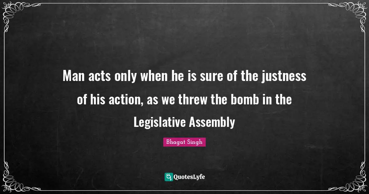 This page presents the quote "Man acts only when he is sure of the justness of his action, as we threw the bomb in the Legislative Assembly". Author of this quote is Bhagat Singh. This quote is about assembly, bombs, men, action,.
