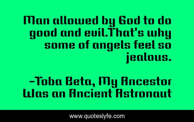 This page presents the quote "Man allowed by God to do good and evil.That's why some of angels feel so jealous.". Author of this quote is Toba Beta, My Ancestor Was an Ancient Astronaut. This quote is about jealous, angel, man,.