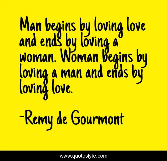 This page presents the quote "Man begins by loving love and ends by loving a woman. Woman begins by loving a man and ends by loving love.". Author of this quote is Remy de Gourmont. This quote is about love, affection,.