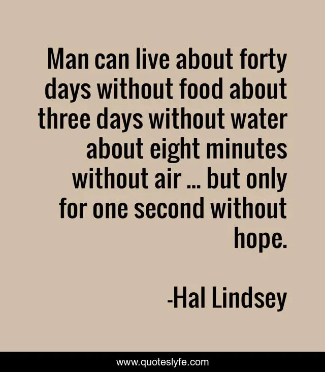This page presents the quote "Man can live about forty days without food about three days without water about eight minutes without air ... but only for one second without hope.". Author of this quote is Hal Lindsey. .