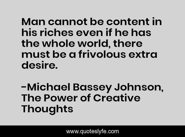 This page presents the quote "Man cannot be content in his riches even if he has the whole world, there must be a frivolous extra desire.". Author of this quote is Michael Bassey Johnson, The Power of Creative Thoughts. This quote is about facts, the-insatiable-life, megalomania,.