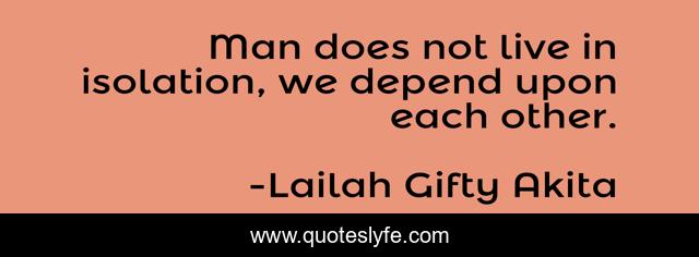 This page presents the quote "Man does not live in isolation, we depend upon each other.". Author of this quote is Lailah Gifty Akita. This quote is about live-and-die, live-and-kicking, live-and-love, live-and-living, interdependent, live-and-learn, live, live-and-life, harmony,.