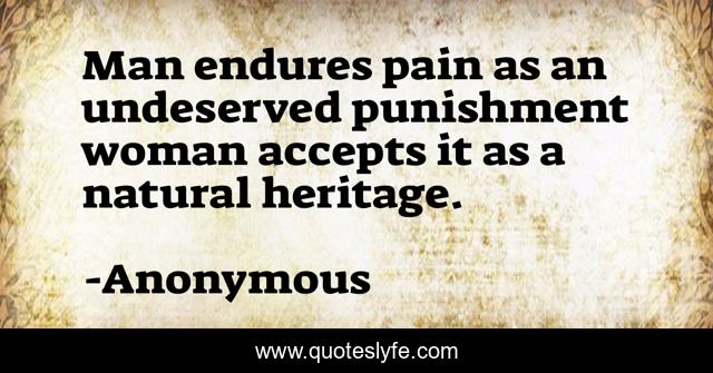 This page presents the quote "Man endures pain as an undeserved punishment woman accepts it as a natural heritage.". Author of this quote is Anonymous. .