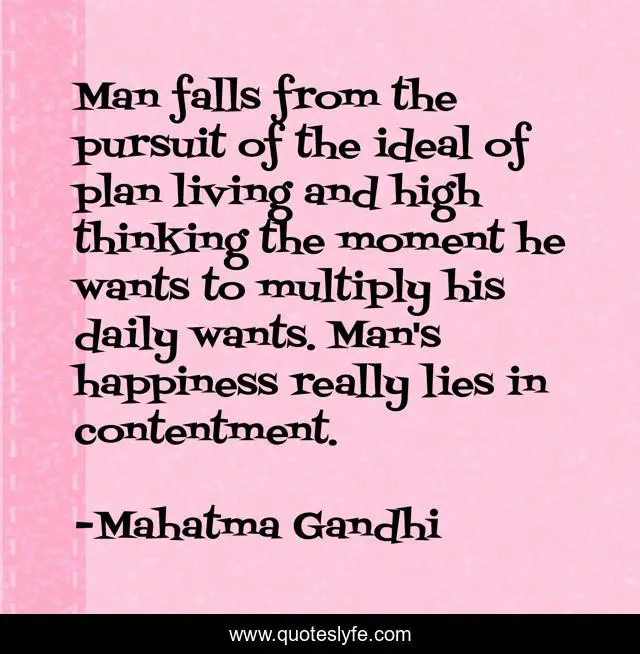 This page presents the quote "Man falls from the pursuit of the ideal of plan living and high thinking the moment he wants to multiply his daily wants. Man's happiness really lies in contentment.". Author of this quote is Mahatma Gandhi. This quote is about thinking, daily, man,.
