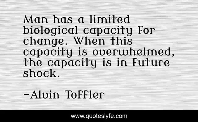 This page presents the quote "Man has a limited biological capacity for change. When this capacity is overwhelmed, the capacity is in future shock.". Author of this quote is Alvin Toffler. This quote is about future, overwhelmed, man,.