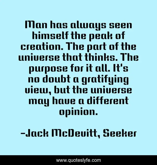 This page presents the quote "Man has always seen himself the peak of creation. The part of the universe that thinks. The purpose for it all. It's no doubt a gratifying view, but the universe may have a different opinion.". Author of this quote is Jack McDevitt, Seeker. This quote is about universe, human-existence, creation,.