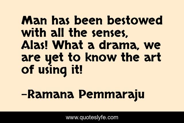 This page presents the quote "Man has been bestowed with all the senses, Alas! What a drama, we are yet to know the art of using it!". Author of this quote is Ramana Pemmaraju. This quote is about senses, humor, communication, drama, stupidity, wit, art, philosophy-of-life, man,.