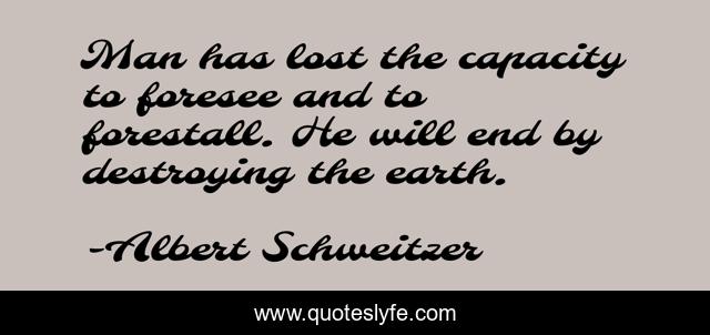 This page presents the quote "Man has lost the capacity to foresee and to forestall. He will end by destroying the earth.". Author of this quote is Albert Schweitzer. This quote is about end, lost, man,.