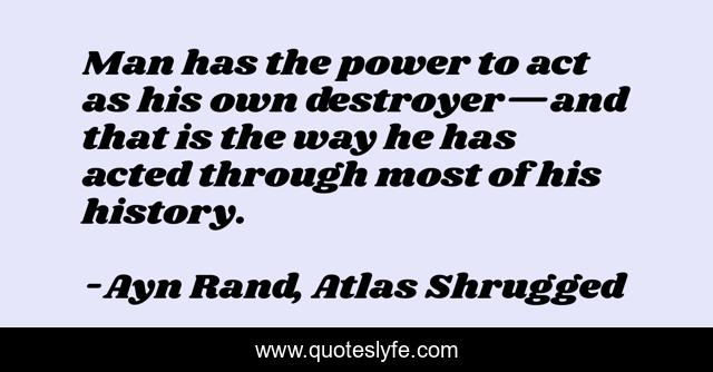 This page presents the quote "Man has the power to act as his own destroyer—and that is the way he has acted through most of his history.". Author of this quote is Ayn Rand, Atlas Shrugged. This quote is about life, good, morals, pursuit-of-happiness, objectivism, philosophy, mind, evil, john-galt,.