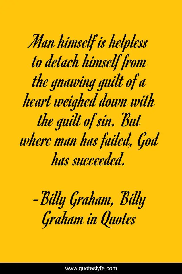 This page presents the quote "Man himself is helpless to detach himself from the gnawing guilt of a heart weighed down with the guilt of sin. But where man has failed, God has succeeded.". Author of this quote is Billy Graham, Billy Graham in Quotes. This quote is about heart, billy-graham,.