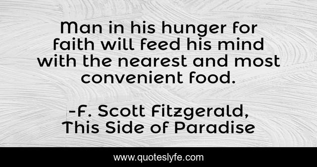 This page presents the quote "Man in his hunger for faith will feed his mind with the nearest and most convenient food.". Author of this quote is F. Scott Fitzgerald, This Side of Paradise. This quote is about faith, still-weeding, food, fitzgerald, amory, mind, paradise, man,.