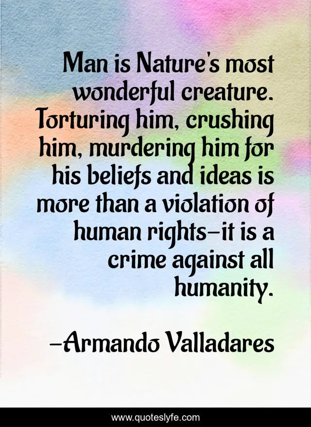 This page presents the quote "Man is Nature's most wonderful creature. Torturing him, crushing him, murdering him for his beliefs and ideas is more than a violation of human rights-it is a crime against all humanity.". Author of this quote is Armando Valladares. This quote is about philosophical, political,.