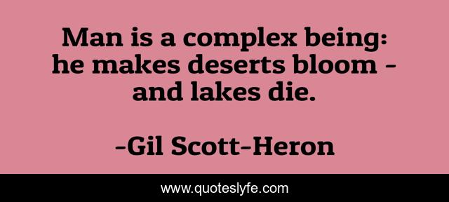 This page presents the quote "Man is a complex being: he makes deserts bloom - and lakes die.". Author of this quote is Gil Scott-Heron. This quote is about environment, conservation,.