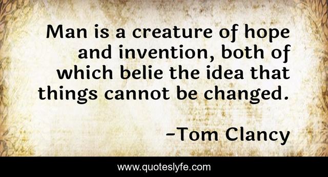 This page presents the quote "Man is a creature of hope and invention, both of which belie the idea that things cannot be changed.". Author of this quote is Tom Clancy. This quote is about invention, idea, man,.