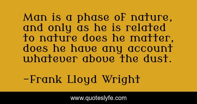 This page presents the quote "Man is a phase of nature, and only as he is related to nature does he matter, does he have any account whatever above the dust.". Author of this quote is Frank Lloyd Wright. This quote is about life, philosophy, man, nature,.