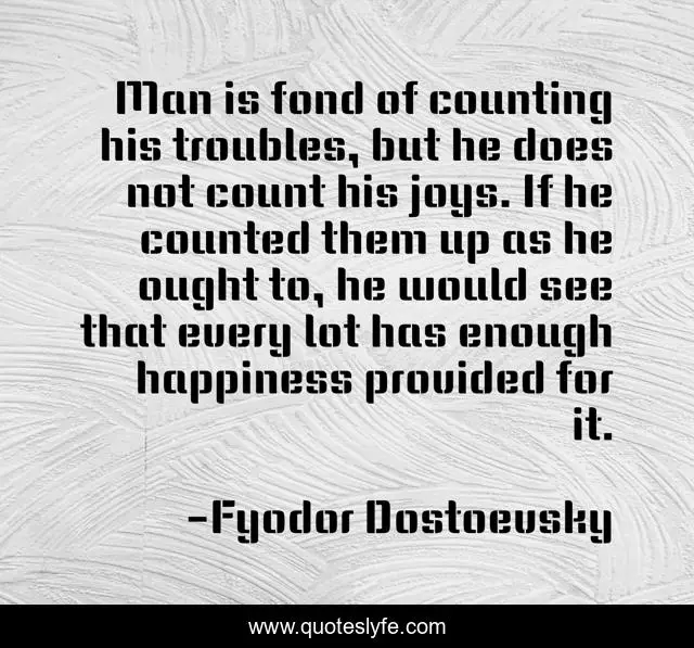 This page presents the quote "Man is fond of counting his troubles, but he does not count his joys. If he counted them up as he ought to, he would see that every lot has enough happiness provided for it.". Author of this quote is Fyodor Dostoevsky. This quote is about see, up, man,.