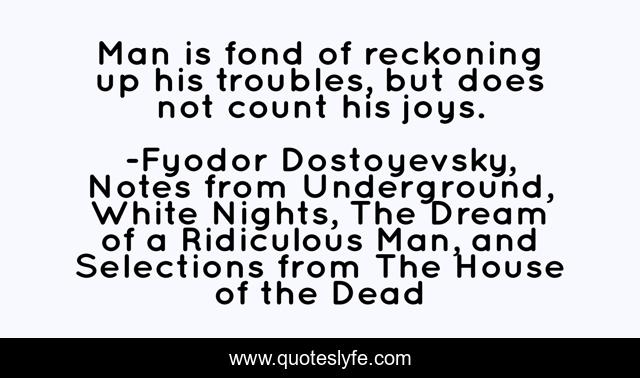 This page presents the quote "Man is fond of reckoning up his troubles, but does not count his joys.". Author of this quote is Fyodor Dostoyevsky, Notes from Underground, White Nights, The Dream of a Ridiculous Man, and Selections from The House of the Dead. This quote is about joy, blessings, happiness,.
