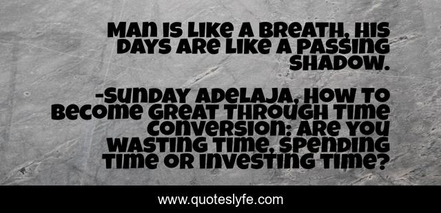 This page presents the quote "Man is like a breath, his days are like a passing shadow.". Author of this quote is Sunday Adelaja, How To Become Great Through Time Conversion: Are you wasting time, spending time or investing time?. This quote is about life, conversion, productivity, wealth, breath, greatness, waste, humanity, product,.