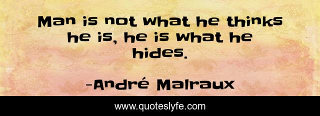 This page presents the quote "Man is not what he thinks he is, he is what he hides.". Author of this quote is André Malraux. This quote is about self-awareness, secrets, lies, deception, man, hiding,.