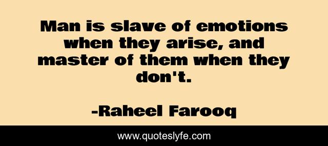 This page presents the quote "Man is slave of emotions when they arise, and master of them when they don't.". Author of this quote is Raheel Farooq. This quote is about sentiments, emotions, self-control, personality-development,.