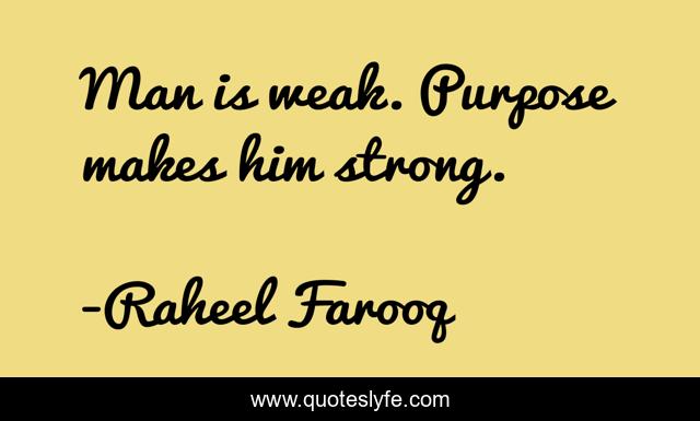 This page presents the quote "Man is weak. Purpose makes him strong.". Author of this quote is Raheel Farooq. This quote is about cowardice, strength, strength-through-adversity, strength-of-character, purpose, purpose-driven-life, strength-and-courage, purposeful-living, man,.