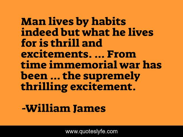 This page presents the quote "Man lives by habits indeed but what he lives for is thrill and excitements. ... From time immemorial war has been ... the supremely thrilling excitement.". Author of this quote is William James. This quote is about boring, days,.