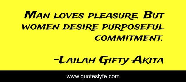 This page presents the quote "Man loves pleasure. But women desire purposeful commitment.". Author of this quote is Lailah Gifty Akita. This quote is about love, relationship, commitment, marriage, inspirational, pleasure, enthusiasm, affection,.