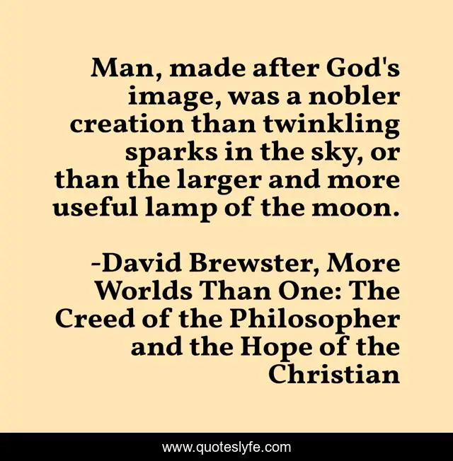 This page presents the quote "Man, made after God's image, was a nobler creation than twinkling sparks in the sky, or than the larger and more useful lamp of the moon.". Author of this quote is David Brewster, More Worlds Than One: The Creed of the Philosopher and the Hope of the Christian. This quote is about god, creation, creationism, made-in-the-image-of-god, god-s-image,.