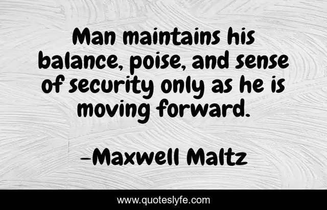 This page presents the quote "Man maintains his balance, poise, and sense of security only as he is moving forward.". Author of this quote is Maxwell Maltz. This quote is about foward, security, balance, poise, sense,.