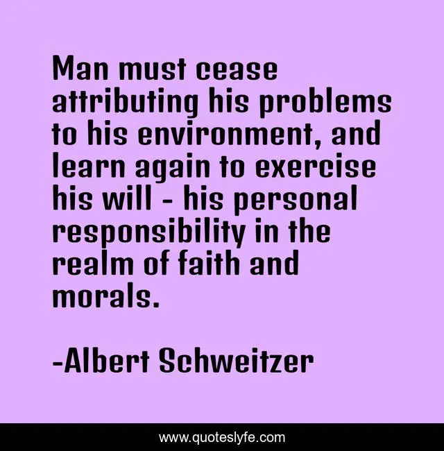 This page presents the quote "Man must cease attributing his problems to his environment, and learn again to exercise his will - his personal responsibility in the realm of faith and morals.". Author of this quote is Albert Schweitzer. This quote is about life, truth,.