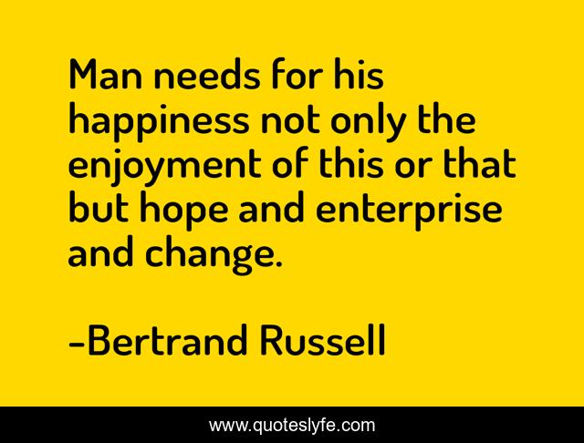 This page presents the quote "Man needs for his happiness not only the enjoyment of this or that but hope and enterprise and change.". Author of this quote is Bertrand Russell. .