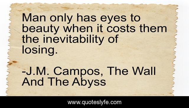 This page presents the quote "Man only has eyes to beauty when it costs them the inevitability of losing.". Author of this quote is J.M. Campos, The Wall And The Abyss. This quote is about fiction-novel, loss, romance, beauty,.