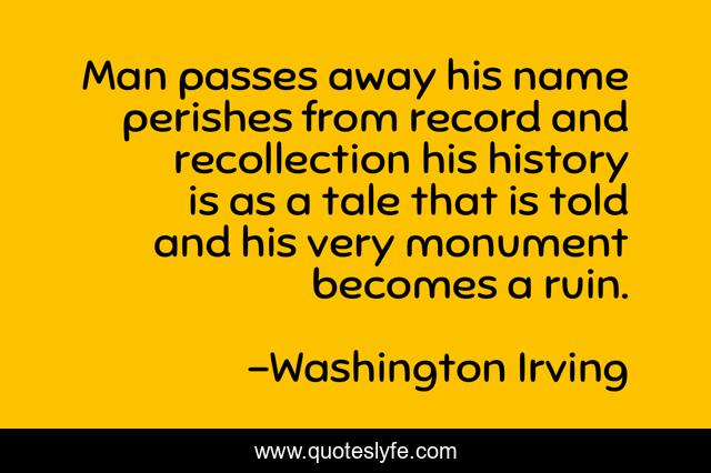This page presents the quote "Man passes away his name perishes from record and recollection his history is as a tale that is told and his very monument becomes a ruin.". Author of this quote is Washington Irving. .