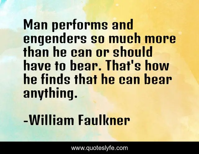 This page presents the quote "Man performs and engenders so much more than he can or should have to bear. That's how he finds that he can bear anything.". Author of this quote is William Faulkner. .