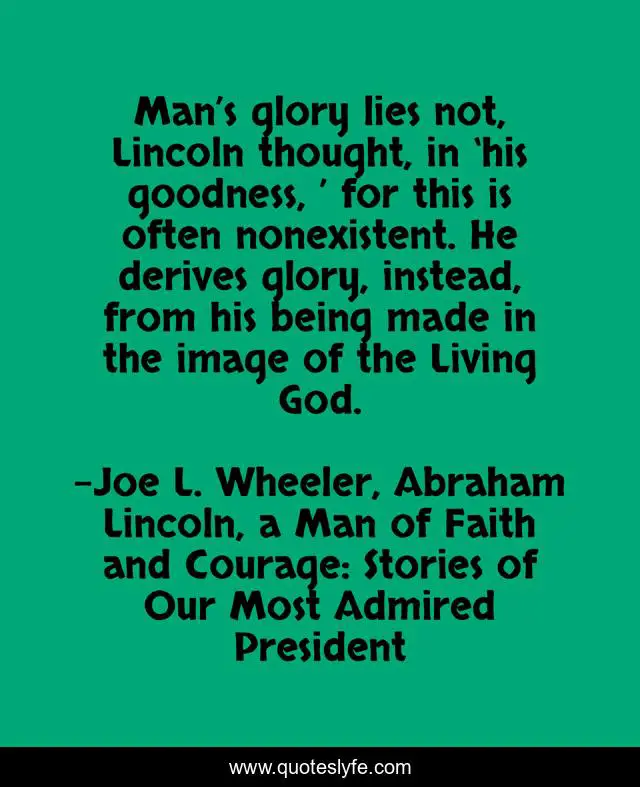 This page presents the quote "Man’s glory lies not, Lincoln thought, in ‘his goodness, ’ for this is often nonexistent. He derives glory, instead, from his being made in the image of the Living God.". Author of this quote is Joe L. Wheeler, Abraham Lincoln, a Man of Faith and Courage: Stories of Our Most Admired President. This quote is about faith, abraham-lincoln, goodness, god,.