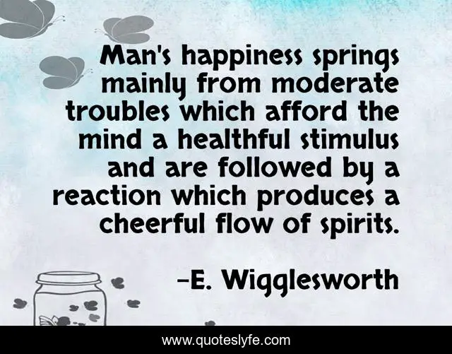 This page presents the quote "Man's happiness springs mainly from moderate troubles which afford the mind a healthful stimulus and are followed by a reaction which produces a cheerful flow of spirits.". Author of this quote is E. Wigglesworth. .