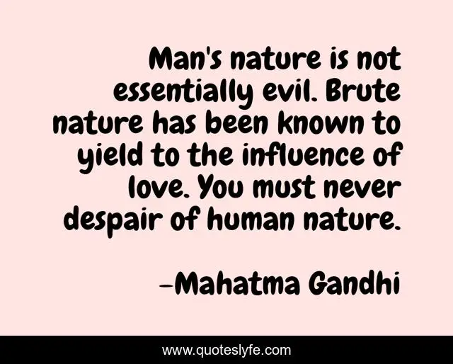 This page presents the quote "Man's nature is not essentially evil. Brute nature has been known to yield to the influence of love. You must never despair of human nature.". Author of this quote is Mahatma Gandhi. This quote is about love, evil, affection, man,.
