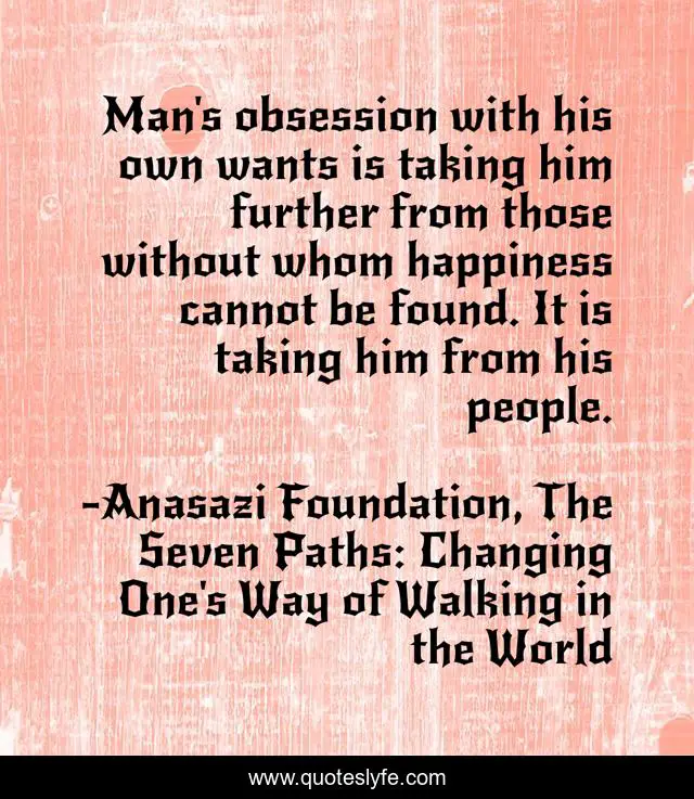 This page presents the quote "Man's obsession with his own wants is taking him further from those without whom happiness cannot be found. It is taking him from his people.". Author of this quote is Anasazi Foundation, The Seven Paths: Changing One's Way of Walking in the World. This quote is about anasazi-foundation, mother-earth, nature, native-american, community, wisdom, healing, native-american-wisdom, anasazi,.