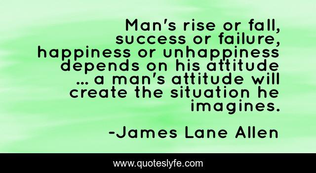 This page presents the quote "Man's rise or fall, success or failure, happiness or unhappiness depends on his attitude ... a man's attitude will create the situation he imagines.". Author of this quote is James Lane Allen. This quote is about behaviour, attitude,.