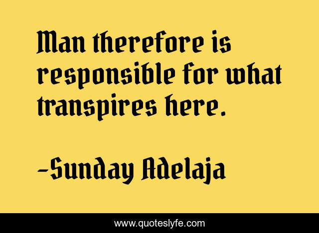 This page presents the quote "Man therefore is responsible for what transpires here.". Author of this quote is Sunday Adelaja. This quote is about transpire, responsible, man,.