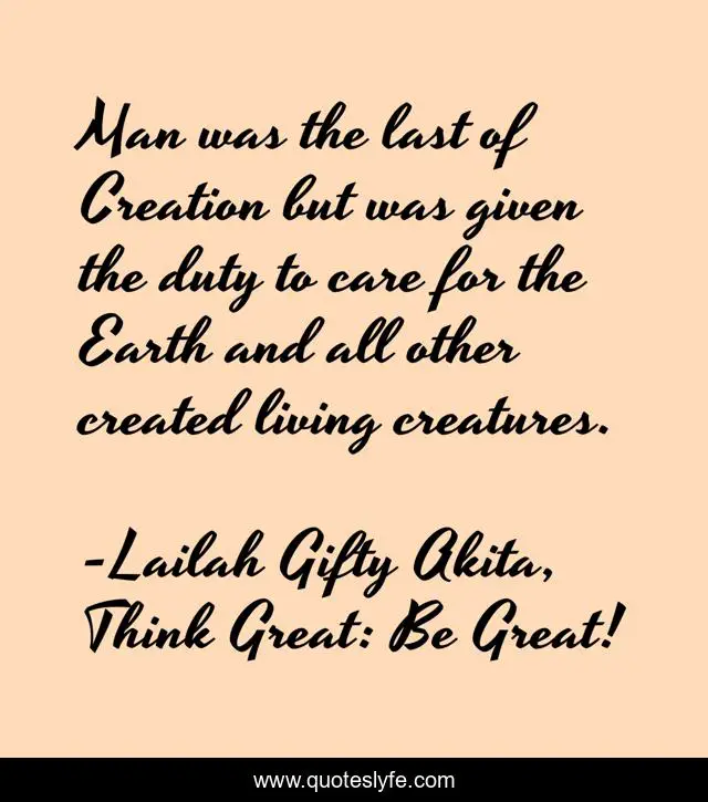 "Lailah Gifty Akita, Think Great: Be Great! Quotes." Quoteslyfe.com, 2025. Fri. 05 Dec. 2025. <https://www.quoteslyfe.com/quote/Man-was-the-last-of-Creation-but-102717>.