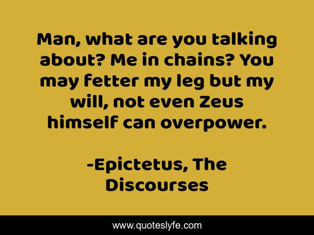 This page presents the quote "Man, what are you talking about? Me in chains? You may fetter my leg but my will, not even Zeus himself can overpower.". Author of this quote is Epictetus, The Discourses. This quote is about freedom, freewill, stoics,.