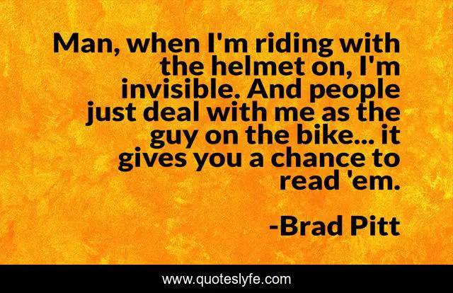 This page presents the quote "Man, when I'm riding with the helmet on, I'm invisible. And people just deal with me as the guy on the bike... it gives you a chance to read 'em.". Author of this quote is Brad Pitt. This quote is about me, bike, man,.
